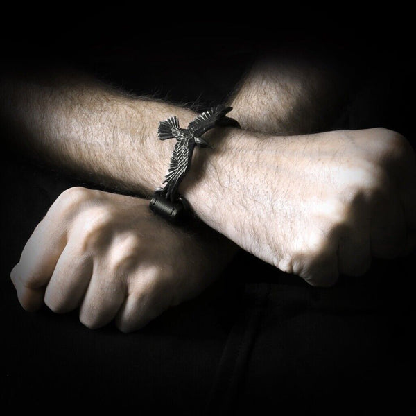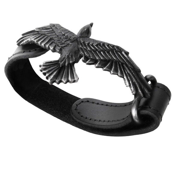 A narrow black leather wrist strap with Velcro-adjustment fastening, supporting a black pewter, spread-winged raven with highlighted trailing edge feathers.