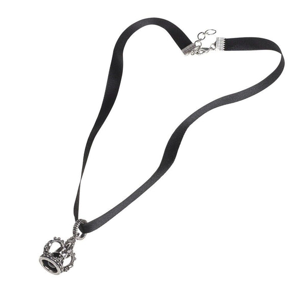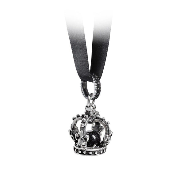 A fully round 3D imperial crown pendant, subtly enhanced with fleur de lis and skulls each side and with a black crystal ball caged inside the frame. Suspended from a decorated pewter ring-bale, through which are threaded a trace chain and 10mm wide black ribbon.