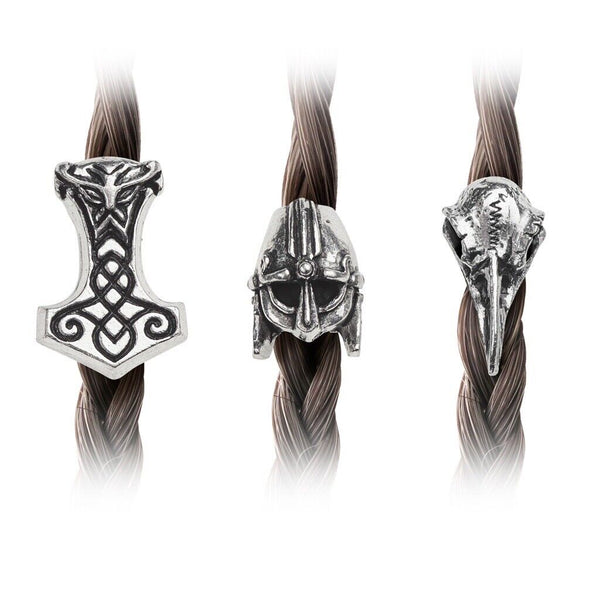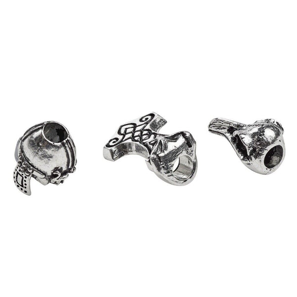 A set of three pewter beads for threading onto hair or a beard; Thor's Hammer, raven's skull and Viking warrior's helmet.