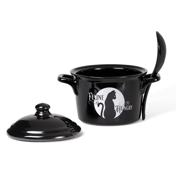 A stunning lidded bowl and spoon set featuring a black cat silhouette and moon design and the words 'Feline Hungry'. Alchemy designed cauldron inspired lidded bowl, complete with spoon. featuring unique Alchemy artwork.