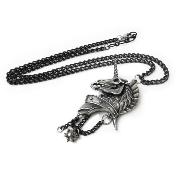 Fear from the darkness - the thundering phantom of an armoured cataphract unicorn, revered in the Scrolls of Carrhae for their terrifying and decisive intervention in battle, against overwhelming oppressors.//(Geistalon; pronounced guy-sta-lon)Antiqued pewter pendant of a heavily armoured skeletal unicorn's head, in profile, with black chain and 'morning star' ball suspended beneath.//On a 20"/51cm black curb chain with 1½" extender ximate Dimensions: Width 1.5" x Height 3.6" x Depth 0.4"
