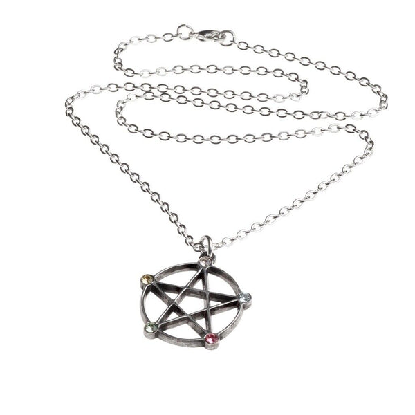 The five elements conjoined within the circle of the universe. Clockwise from the top, the CrystalcrystalÕs pastelised colors represent spirit, water, fire, earth and air. Approximate Dimensions: Width 1.06" x Height 1.34" x Depth 0.16" Chain: 18" Materials: Pewter, Pastel Colored CrystalCrystals