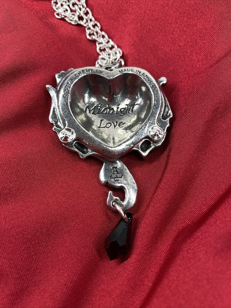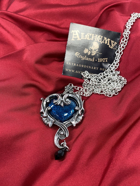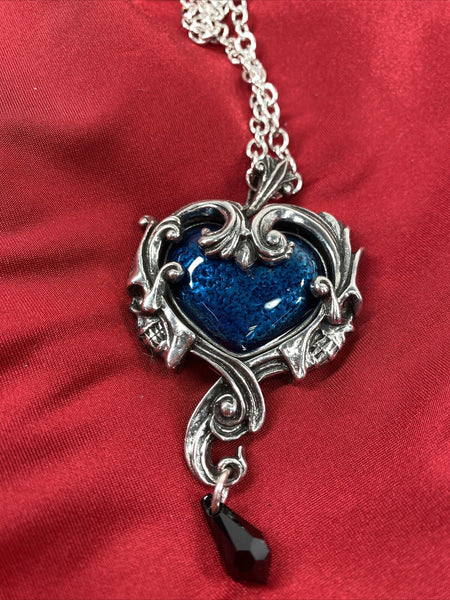 A dark and Delphic romance of the heart; an assignation between two strange and exotic creatures from another place, amorous beneath the stars in the night sky. Approximate Dimensions: Width 1.69" x Height 3.03" x Depth 0.55" Chain: 32" Materials: Pewter, Midnight Blue Stone, and Black Dropper