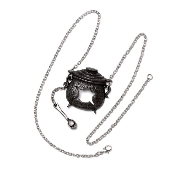 Mystically charmed, kettle black and stirring-up trouble again - a subtle expression of your uniqueness and remarkable talents. This piece will be at the top of any witches wish list! Magic up a special witchy treat! A miniature witches cauldron necklace, decorated with a cut out triple moon detail. Complete with movable lid and the sweetest ladle with skull detail!