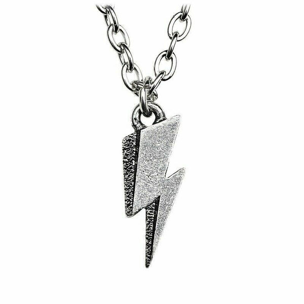 Lightning bolt logo design based-on Bowie's early 1970s aesthetic. An antiqued English pewter pendant on 21" trace chain.