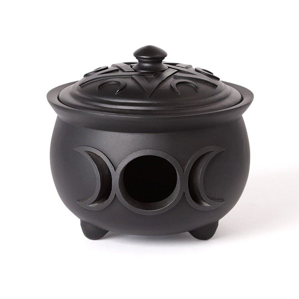 A finest quality resin pot with triple moon cut out detail and pentacle and moon detailed lid.