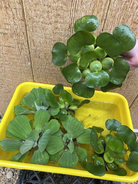 Water Hyacinth, Scientific name: Eichhornia crassipes (Mart.) Solm, This floating water plant while invasive and not to be released in the natural environment, is the best friend of small pond owners who's water quality lacks from adequate filtration. Each plant carries its own inflated leaves as ballast and the root are left to free float below the plant. These roots not only take up nutrient but provide surface area for biofiltration and add to the diversity of small aquatic animals that eat other helpful nuisances such as algae and excess bacteria. These plants are capable of rapid growth but are easily managed in a small pond or fountain by simply tossing the excess. They make good breeding mats for Koi eggs (if your Koi leave them alone that is - see picture) and they can be place in the pond when the fish begin spawning and some eggs will cling to them allow you to easily remove the plants and have the babies hatch elsewhere. Because they are minimally frost tolerant, many places in the US (except the southern states) simply treat them as an annual and replace them every year. The generally bloom summer and early fall.